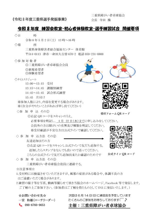 【三重県障がい者卓球協会主催】令和8年度練習会教室・初心者体験教室・選手練習試合