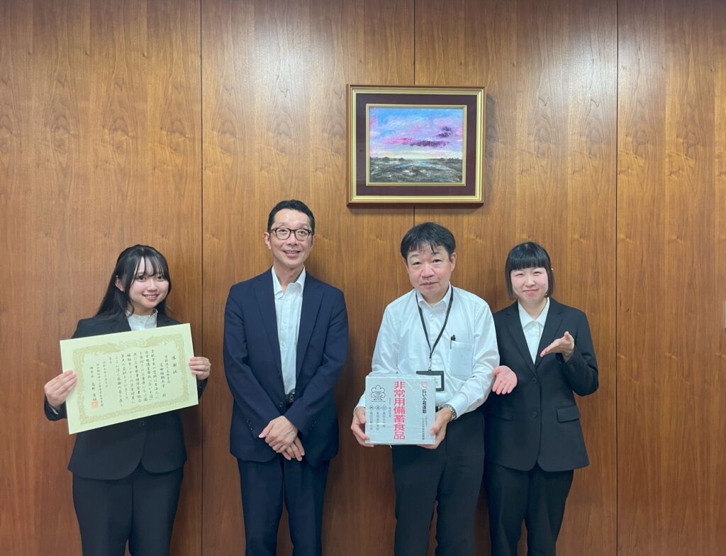 学校法人高田学苑様より「白い小箱運動」として非常用備蓄食品のご寄付をいただき、10月7日(火)に高田短期大学様にお礼の気持ちを伝えに伺いました。